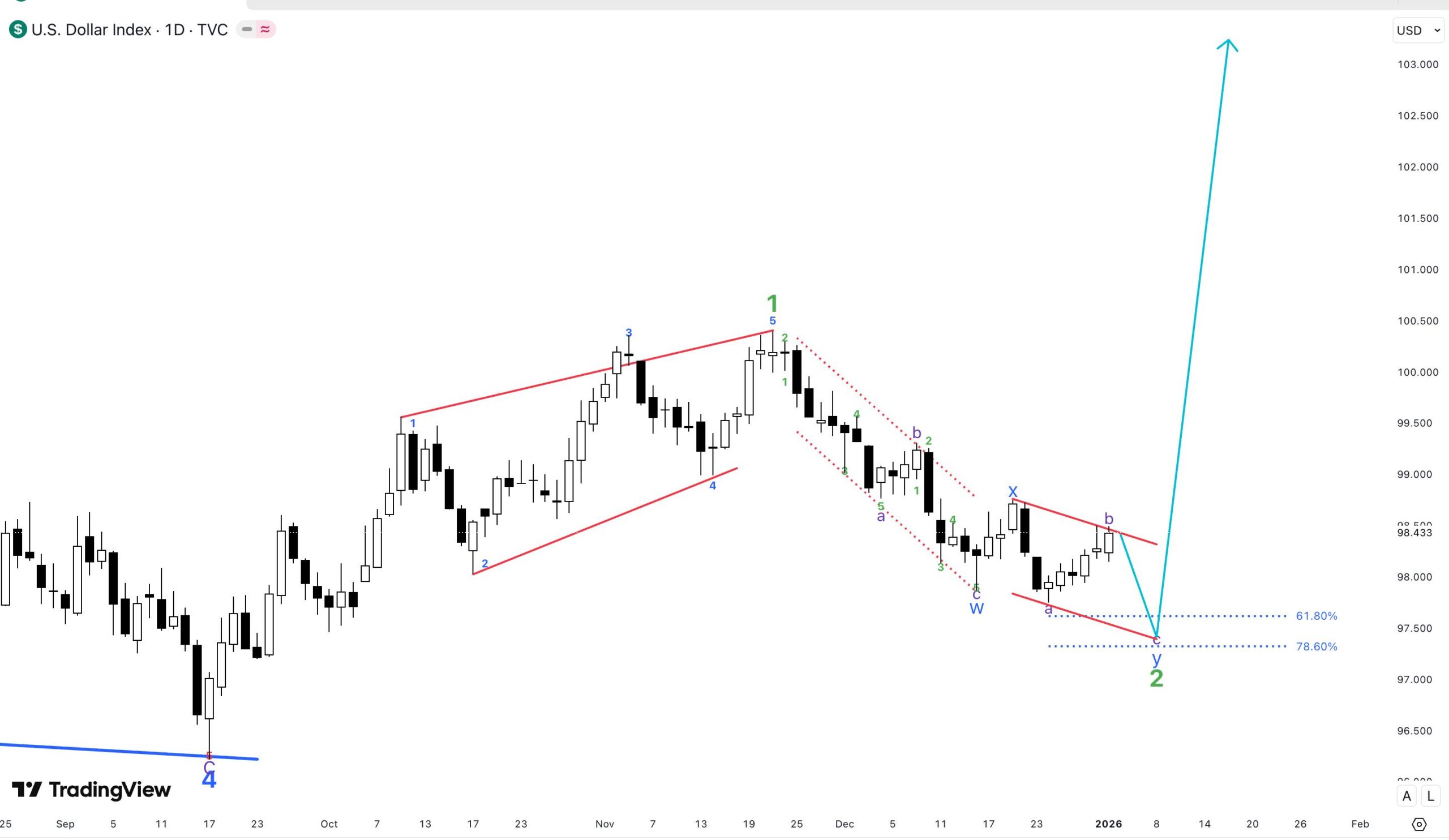 DXY has completed a corrective pattern at the lower channel boundary (96.50-97.00). This creates